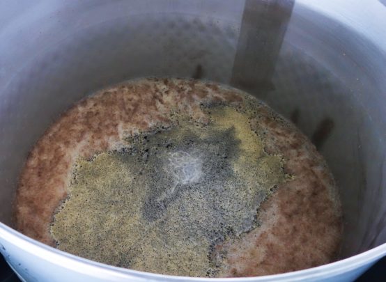 オープンファーメンター内部の様子。画像のビールは、限定ビールのボック。初日のため、まだ発酵が始まったばかり。