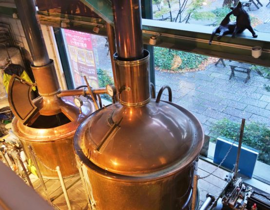 「ビアカフェあくら」の2Fからは醸造設備を見ることができる。