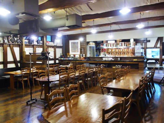 「レストラン プラッツ」の1F。天井の梁など蔵のまま使っている。
