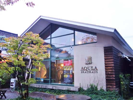 ブルワリーと「ビアカフェあくら」のある建物。外壁には「a蔵」のロゴも描かれている。
