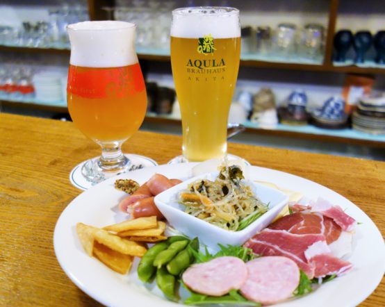 「秋田美人のビール」(右)と「なまはげIPA」(左)。「ビアカフェあくら」では、2,000円でビール2杯+日替わりオードブルが楽しめるセットがある。軽く食べて飲みたいときには嬉しいメニュー。