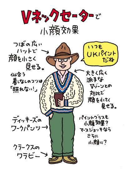 顔の大きい人はVゾーンをなるべく広くするべきでなのである。ベストの回にも登場したチルデンセーターはVゾーンにラインが広がっているので一段と小顔効果が高まる。