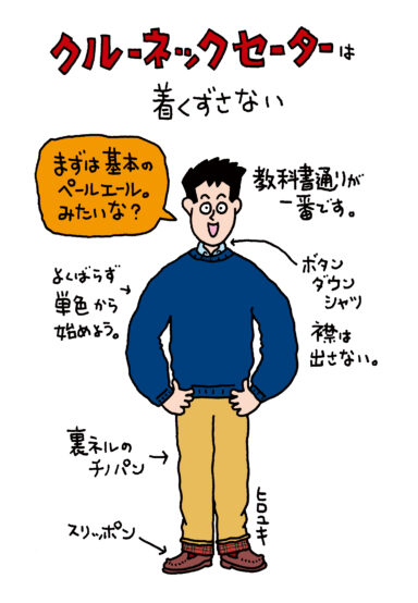 襟が出ないようにボタンダウンシャツを着て、チノパンにローファーを合わせる。唯一の遊びは裏ネルのチノパンを折り返してチェック柄を覗かせる程度か。