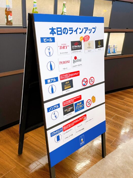 ビールはスーパードライ・スーパードライ エクストラコールド・マルエフ・マルエフ黒生・ペローニ(瓶)・ピルスナーウルケル(瓶)がありました。また、アサヒビールは「スマートドリンキング」を推進しており、アルコール分0.5%の微アルコールビールテイスト飲料「アサヒ ビアリー」や、ノンアルコールビールテイスト飲料「アサヒドライゼロ」、「アサヒゼロ」も用意してありました。また、自身でアルコール度数やフレーバーを選択でき、好みのオリジナルドリンクが作れる自動サーバー「MY FLA-BAR (マイ フレーバー)」もありました。