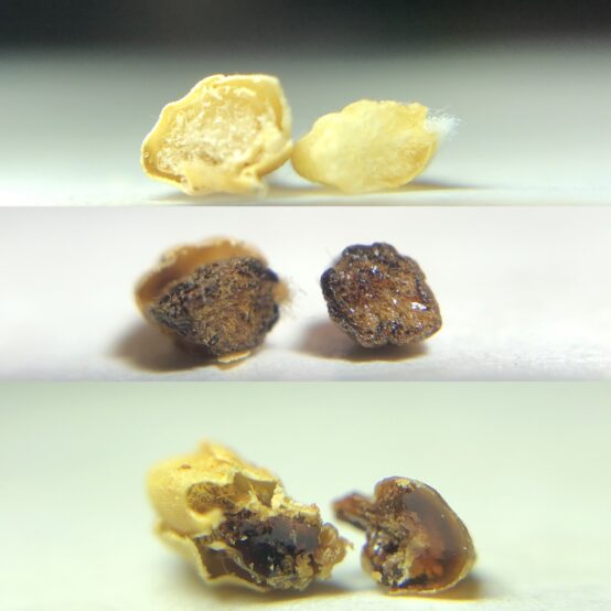 オリゼーモルト断面図 上段ベースモルト、中段ブラウンモルト、下段カラメルモルト 画像提供:ORYZAE BREWING