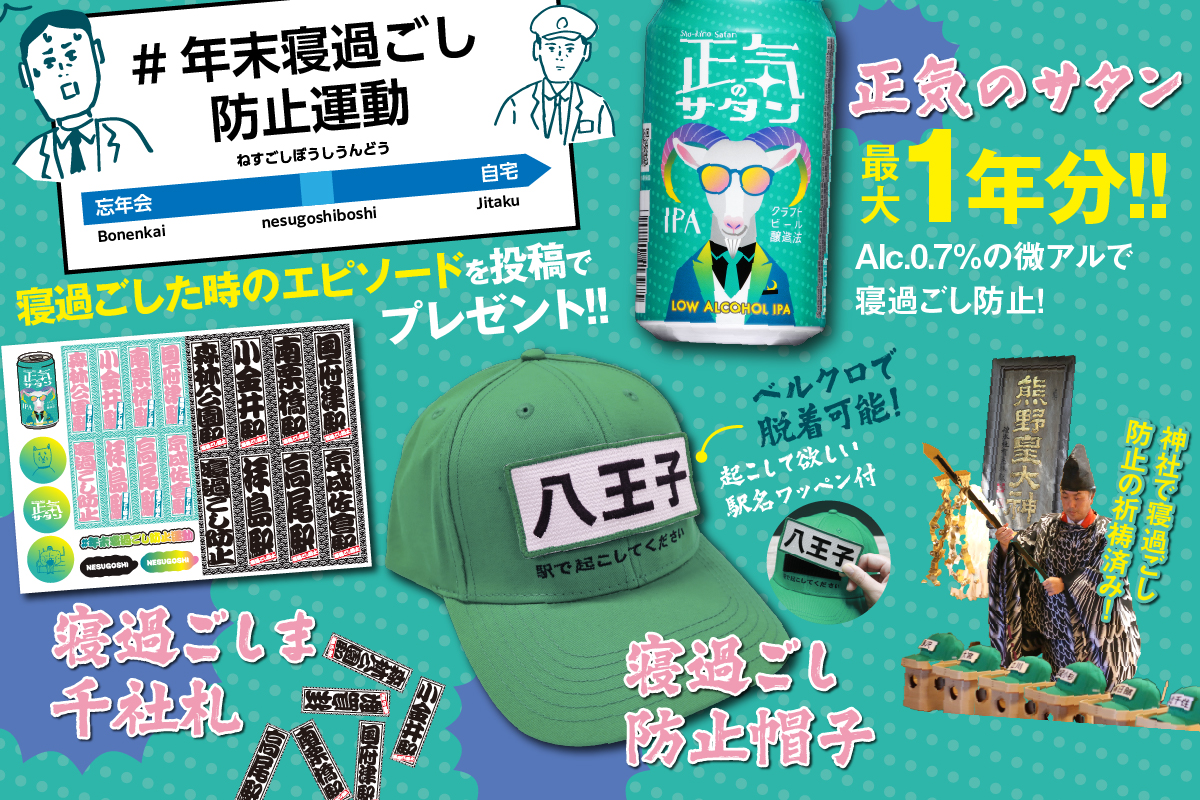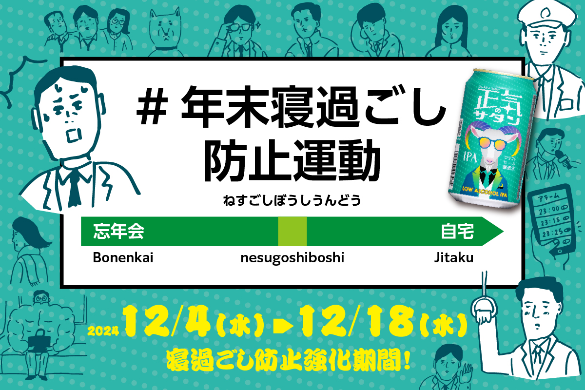 忘年会シーズンである12月は、一年の中でも飲酒機会が増加する時期だそう。そこでヤッホーブルーイングは、適正飲酒を呼びかける「#年末寝過ごし防止運動」を実施すると発表。実施期間は、12月4日(水)から18日(水)までの2週間です。楽しく健康的にお酒と付き合えるよう、同社の製品であるアルコール度数0.7%の微アル飲料「正気のサタン」への置き換えを呼びかけます。