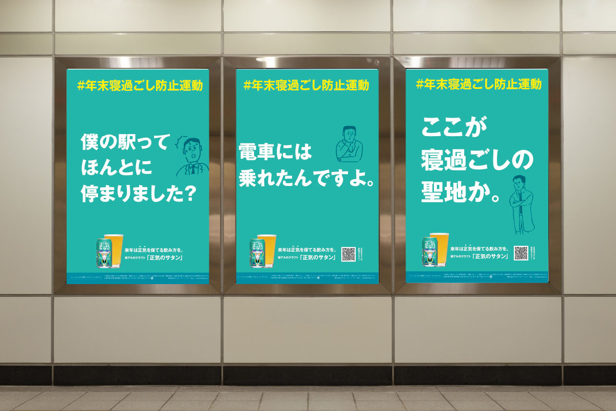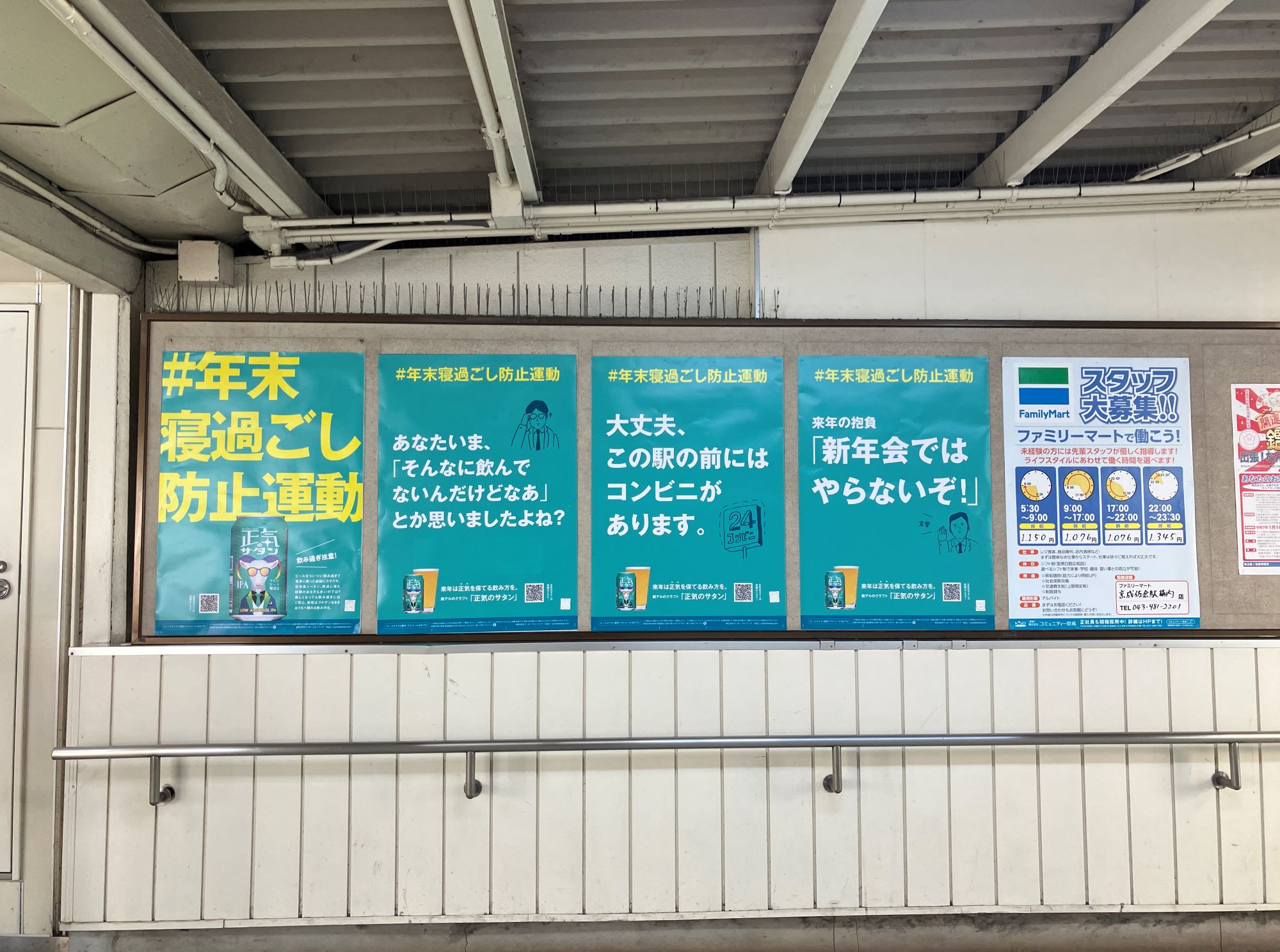 ①寝過ごし防止ポスターの掲示「来年は正気を保てる飲み方を」