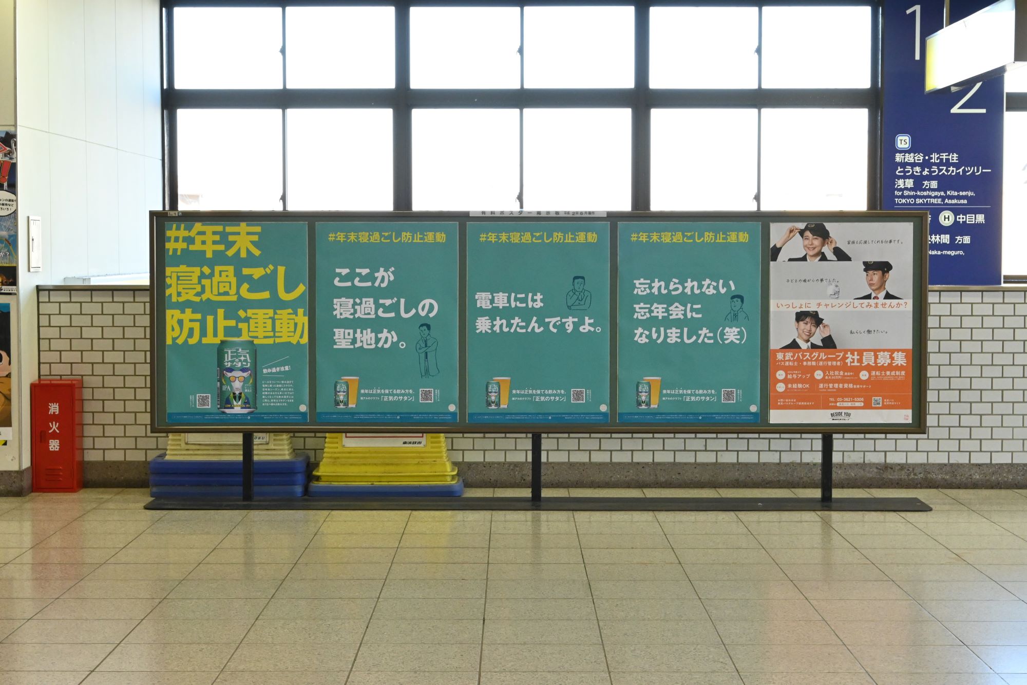 南栗橋駅(東武日光線)・森林公園駅(東武東上線)をはじめ、都心の終着駅に寝過ごし防止を呼びかけるポスターを掲示します。ポスターの内容は、お酒を飲み過ぎてしまった時に起こる「寝過ごしあるある」などの全21種類です。