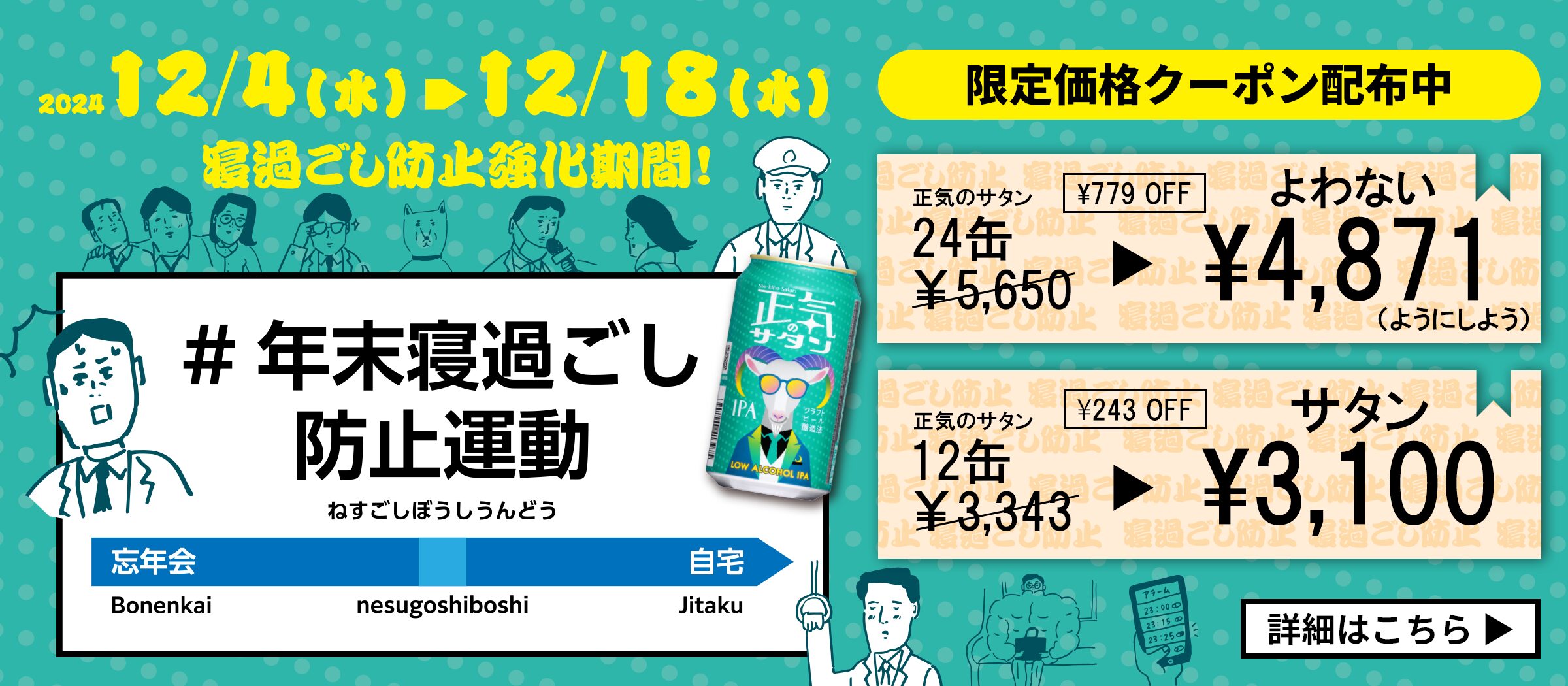 公式通販サイト「よなよなの里(本店)」にて、アルコール度数0.7%のIPA「正気のサタン」の割引クーポンが配布されます。対象期間は、2024年12月4日(水)から18日まで。4,871円(よわない)という割引後価格からは、ヤッホーブルーイングらしい遊び心がチラリと感じられますね。
