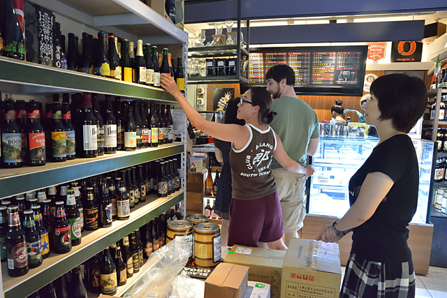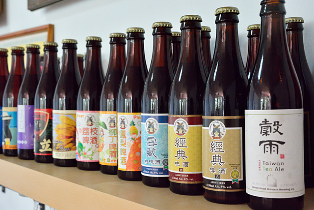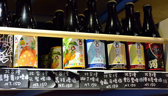 棚の一角を占める北台湾ビール。左の「鳳梨(パイナップル)」と「柳丁(オレンジ)」はフルーツビールだが、訪れたときは、果物の旬が過ぎていたので生産は中止されており、在庫限りとなっていた。一番右の「獨立」(閃靈獨立啤酒)は、台湾のロックバンド「閃靈(ソニック)」が台湾独立建国のコンセプトで創作した際、その考えに共鳴して造ったコラボビール。ビアスタイルはヴァイツェン。第二弾のコラボビールはセゾンが予定されている。