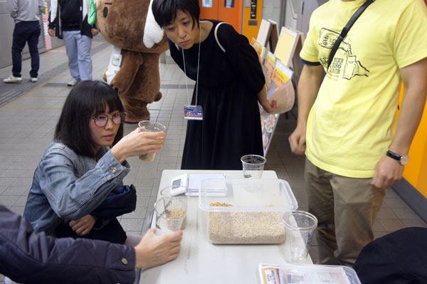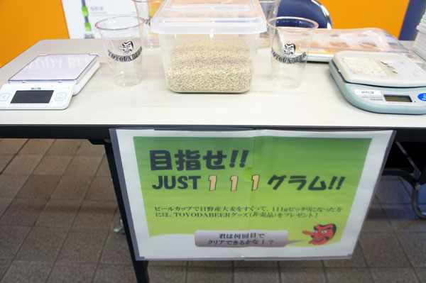 「目指せ!!JUST111グラム!!」はビールカップに日野産大麦をすくい、111gぴったりにできたら非売品のTOYODA BEERグッズがもらえるゲーム。