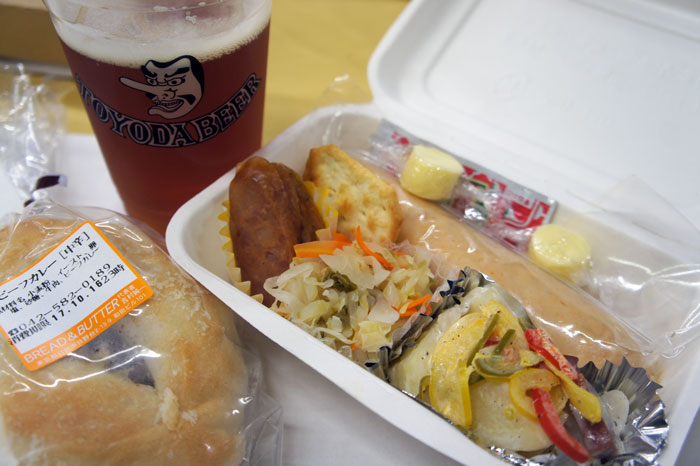 17:00の出発ということで、乗り込むとテーブルにはおつまみセットがスタンバイ!そこに、TOYODA BEERの天狗のイラストが印刷されたカップになみなみ注がれたビールがどんどん配られます。