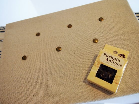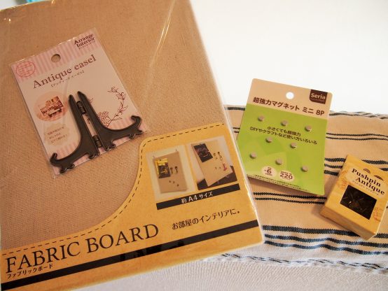 今回の材料。「100円ショップのSeria(セリア)」の「超強力マグネット ミニ8P」と「Pushpin Antique(プッシュピン アンティーク)」「FABRIC BOARD(ファブリックボード)」の組合わせが、取れにくく、かつ外しやすくて便利です。