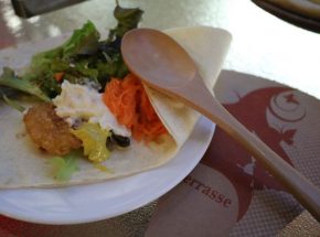たっぷりのサラダにソーセージ、キャロットラペやカレーソースなどピタブレッドに巻いて、Terrasseのイメージイラストの描かれた紙製のケースにクレープを食べる時のように入れて、さあ、召し上がれ!