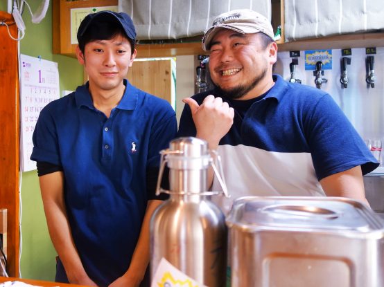 馬場哲生氏(右)の笑顔は、周りも元気にしてくれる。醸造を担当している土田耕司氏(左)はサービングにもこだわり、各ビールが1番美味しく飲めるよう注いでくれる。