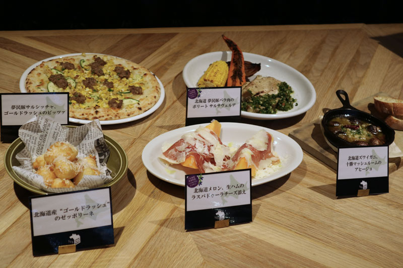 「北海道 夢民豚バラ肉のボリート サルサヴェルデ」と「北海道メロン、生ハムのラスバドゥーラチーズ添え」。ハスカップの酸味が、料理それぞれの味わいを引き立てる役割に。また、上記2品に加え、北海道の食材を使ったメニューも展開しています。