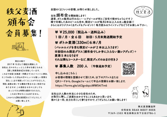 まだ先行きが不透明な状態ですが、秩父の熊たちが情熱を注いでつくったビールを、ここでしか手に入らないグッズとともにお家で味わってみてはいかがでしょうか。
