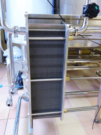 こちらはホップ投入後の麦汁を発酵タンクに移す際に急速に冷やす熱交換器。冬は冷えて動かなくなってしまうので、電気毛布を掛けて故障を防いでいる話が興味深かったです(この機械、かなり高額です)。【画像は2017年撮影】