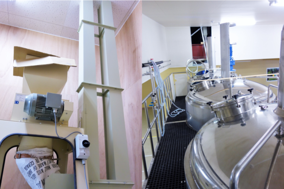 左の機械で麦芽を破砕。破砕された麦芽は、管を通じて糖化釜に入れられる(右の画像、1番奥にあるのが糖化釜。さらにその奥に空いている空間から出ている管から麦芽が投入される【画像は2017年撮影】