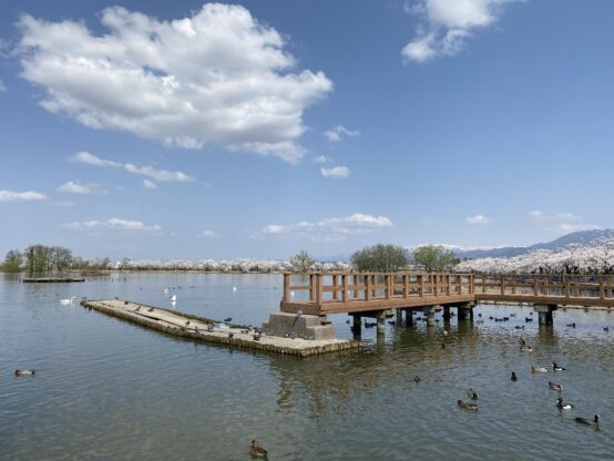 瓢湖(ひょうこ)。冬は白鳥で埋め尽くされる。