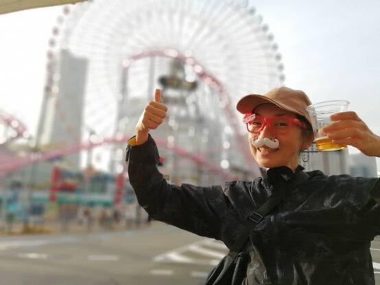 クリスマス前ならでは!トナカイやサンタの飾りもビアバイクに用意がありました。装着すれば更にワクワク、楽しい気分!そんな筆者をガイドさんが撮ってくれた記念写真。横浜コスモワールドの大観覧車をバックにクラフトビールを持ってご機嫌です♪