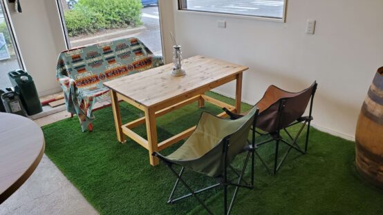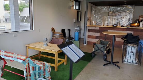 店のフロントは全面ガラス張りになっており、店内スペースの半分醸造所として使われてます。パブにはバーカウンターとテーブル席があり、キャンプ場のような設定のエリア人工芝が敷かれ、店内でありながらアウトドアのような気分を味わえます。