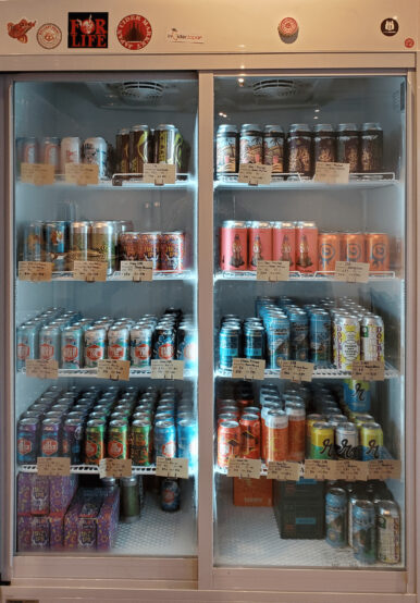 To the right of the bar counter there is a refridgerator full of beer cans. It contains maily IPA’s since that is
