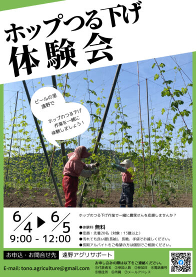 そんな遠野で活動をしている団体「遠野アグリサポート」が、6月4日(土)・5日(日)に「ホップつる下げ体験会」を開催します。ホップの成長期で栽培の農繁期の今、農作業に実際に入り農家をみんなで応援するイベントです。