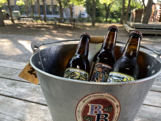 タップルームで心と喉を潤した後は、ボトルビールを買ってテントへと戻る。3本以上買うと貸し出ししてくれるバケツは、もちろんベアードビールのロゴ入りだ。氷がたっぷりと入ったそれで子どもたちはリンゴジュースを冷やし、料理をしながらパーティを始める。