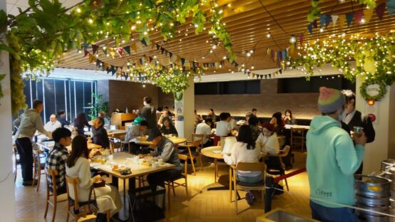 会場内にも柱にはリース、天井にはホップが飾られ、フレッシュホップフェストの雰囲気を盛り上げます。店内は215席のところ各回100名の定員を設けているため、比較的ゆったりとした雰囲気。参加者はテーブルごとに会話を楽しむ人や、テイスティングに集中する人など、それぞれの楽しみ方で過ごしていました。
