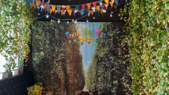 1階の奥にはフォトブースが設けられており、記念撮影も楽しめるようになっていました。自然光の入る窓際のため、本当にホップ畑にいるような感覚になれました。