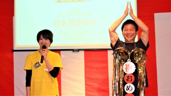 ここで、隠れ節目を迎える全ての人々を祝して、くす玉が割られました。てんちょの首に掛かっていたミラーボールのような物は、このためのくす玉だったのです!会場は笑いと盛大な拍手に包まれておりました。