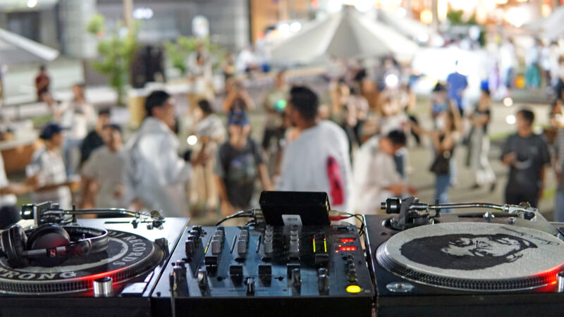 音楽が鳴り響く駅前広場。にぎやかに並ぶカレーやホットドッグの屋台。