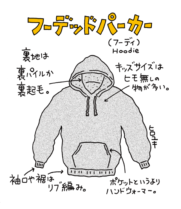 私たち日本人が『フーデッドパーカー』と呼んでいるアイテムは、海外では『フーデッドスウェットシャツ』または『フーディ』と呼ばれている。