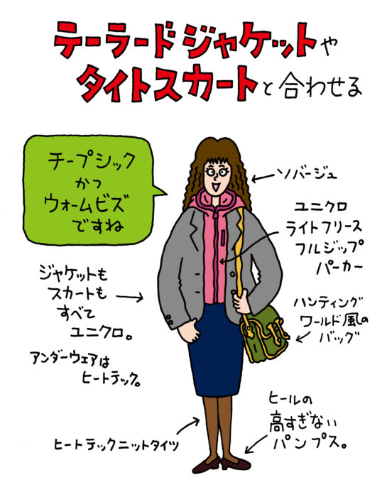 テーラードジャケットやタイトスカートといった”オフィシャルな仕事服”にフーデッドパーカーを刺しこむことで、変化が生まれる。