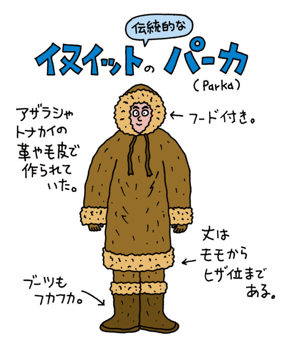 パーカーの語源は、アラスカのイヌイットが着ていた防寒性の高い毛皮の上着”parka=パーカ”と言われている。頭を覆うフードが付いているのが一般的だったので、フード付き上着をパーカーと呼ぶようになった。