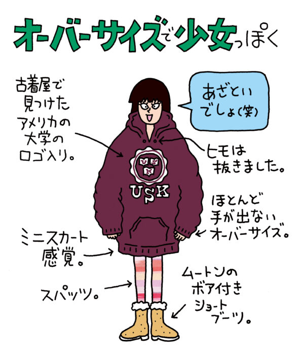 ブカブカの身頃、手がかすかに出るくらいの長い袖、ミニスカート感覚の裾。