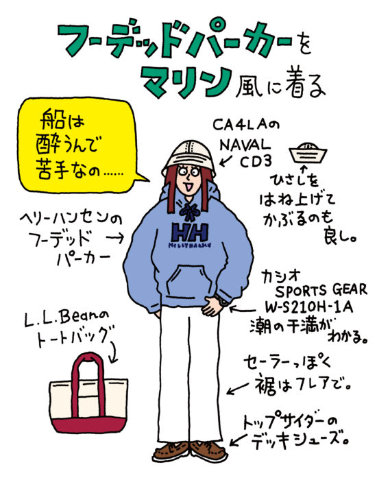 以前は『ヨットパーカー』と呼ばれていただけあり、マリンルックとの相性はとても良い。