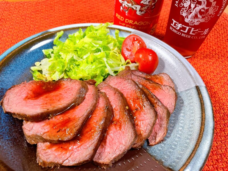 ビールのローストモルトと、ローストビーフの焦げ感が”ロースト”つながりで合うのではと想像。牛肉はこしょうたっぷりめで仕込みました。ソースは和風(肉汁・本つゆ・みりん・おろしにんにく)でにんにくのパンチも利かせたものをかけ、いざペアリング!