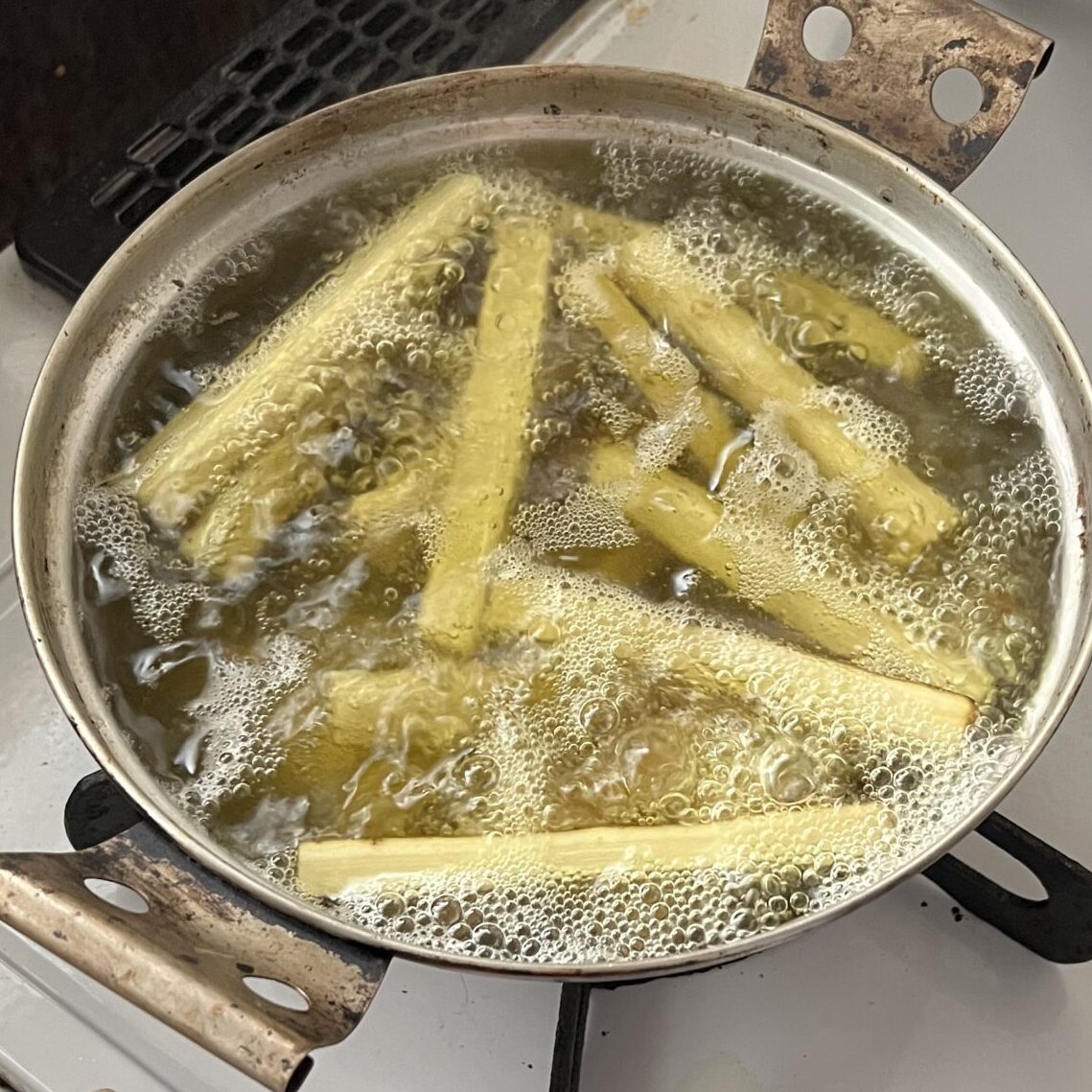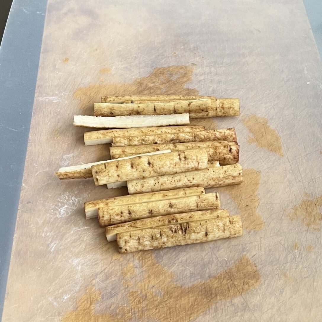 - <牛蒡の蜜煮>牛蒡を洗い約12cmに切り4つ割にし、分量外の水で6〜7分下茹でする。(写真はまとめ作りをしているので3倍の分量です)