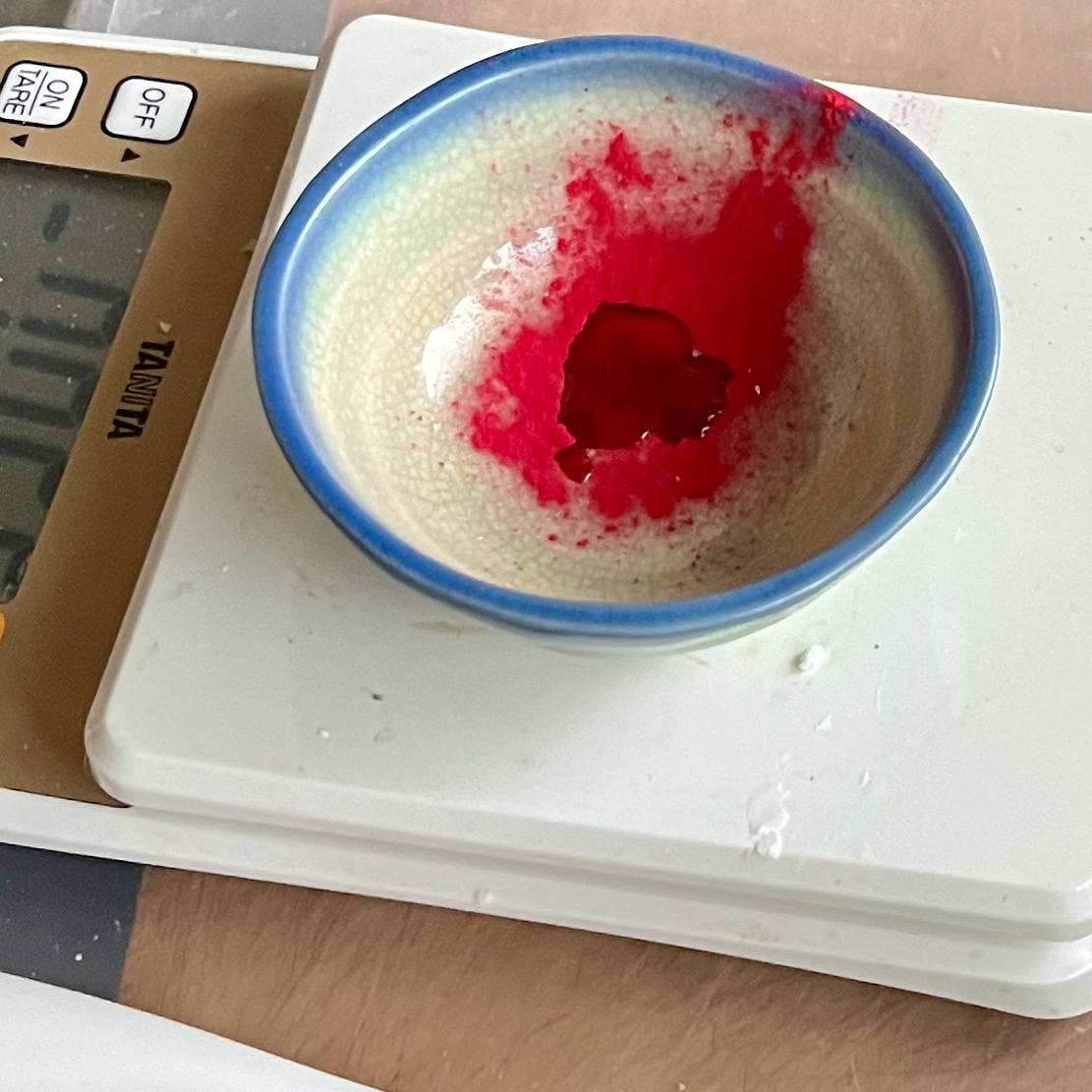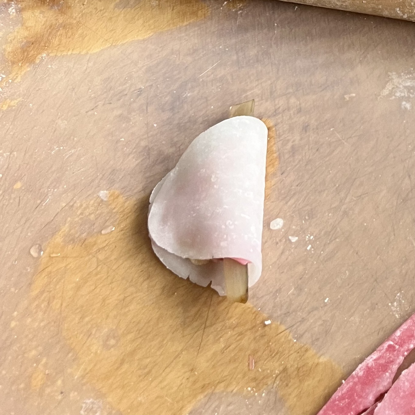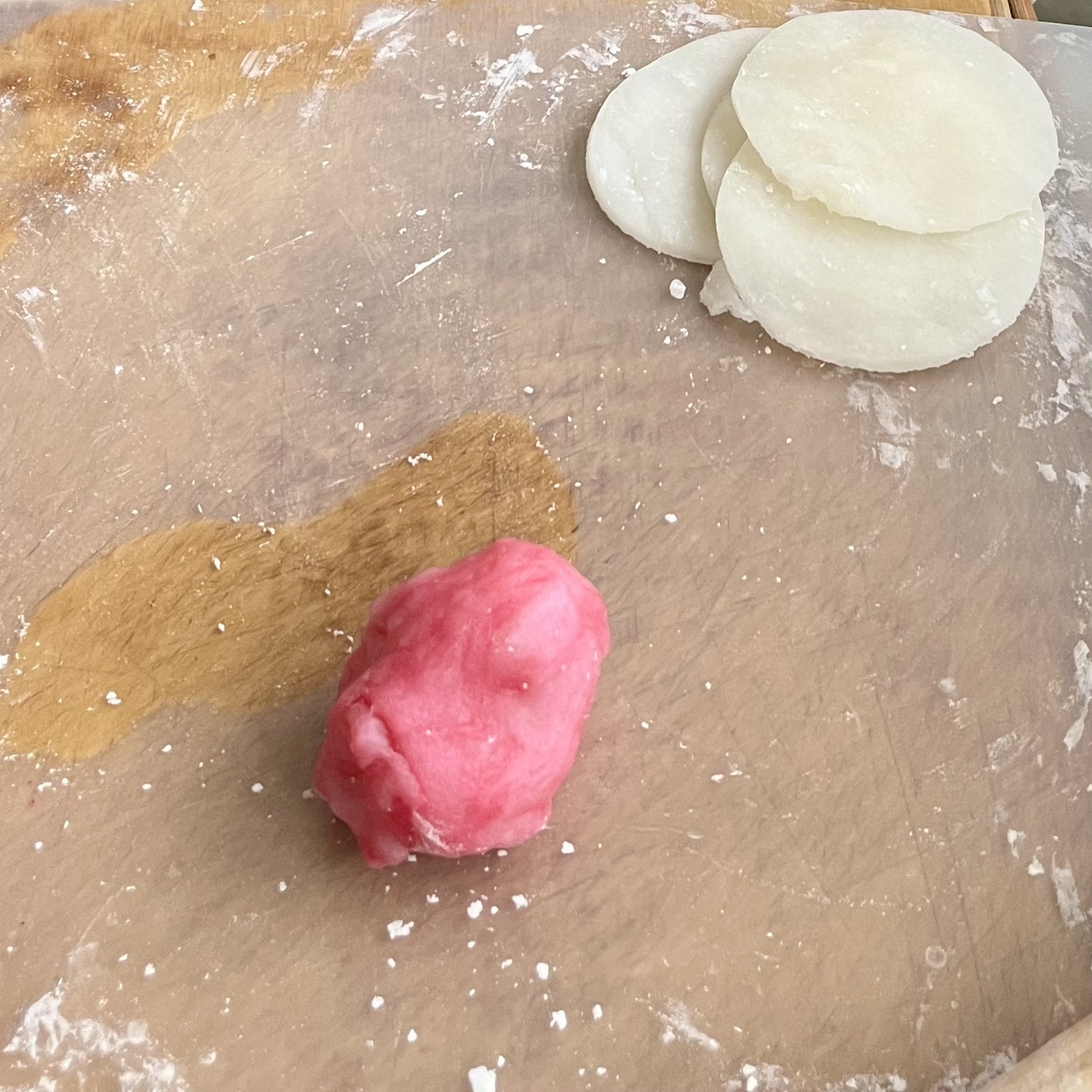 - 抜いた残りの餅生地を再度丸め、ごく少量の水で溶いた食紅を混ぜ色をつける。
