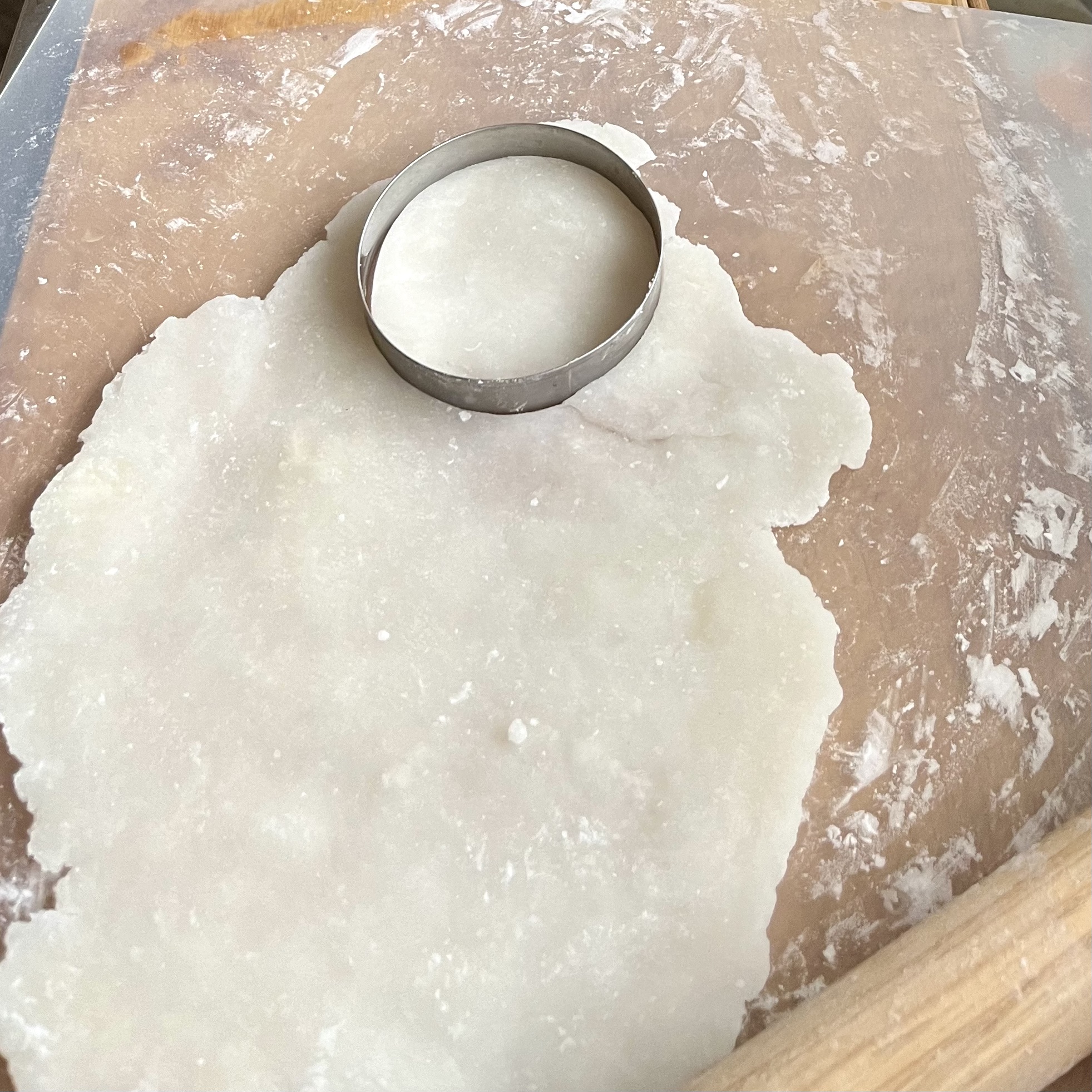 - 約8cmの丸型で4枚抜き、さらに麺棒で伸ばし楕円形にする。