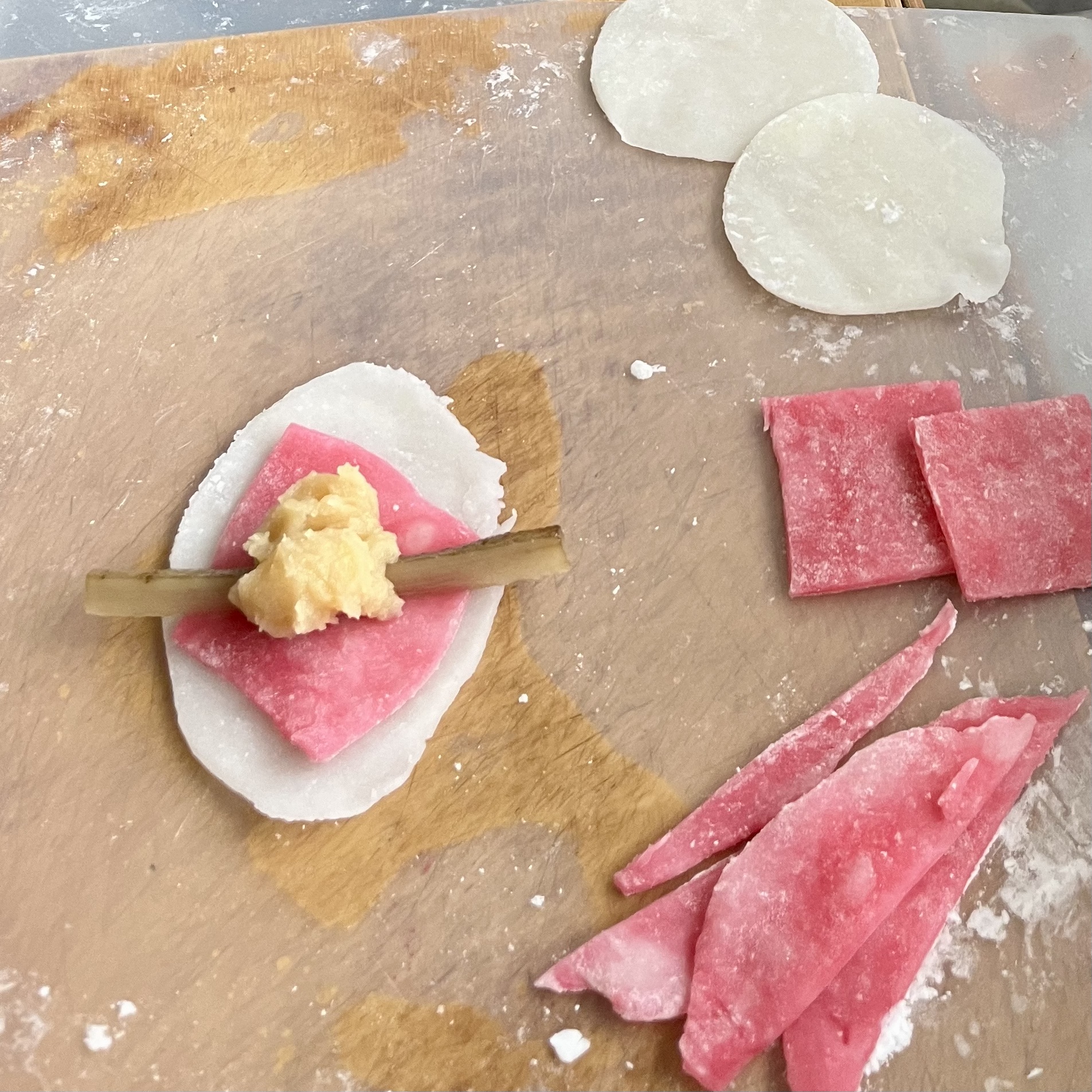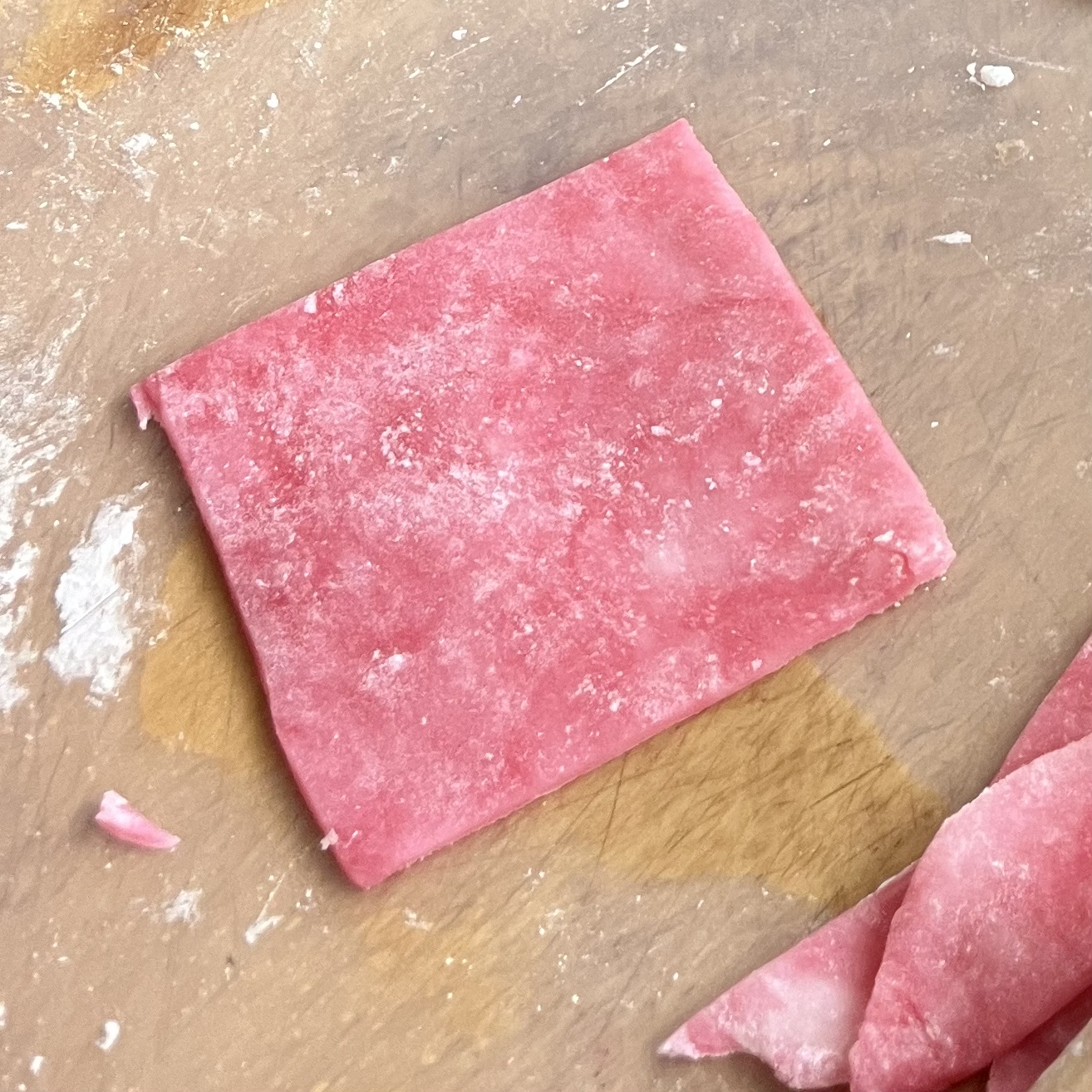 - 紅色になった餅生地を同様に伸ばし、8cm角に切る。さらに麺棒で伸ばし、菱形にする。