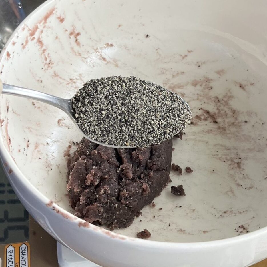 今回の茶通は市販の漉し餡にすり胡麻を混ぜた胡麻餡にして風味を強めました。