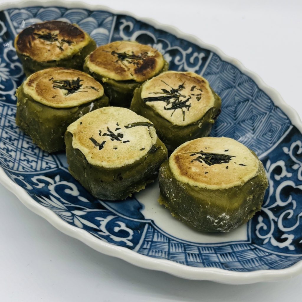 茶通は、抹茶を混ぜた小麦粉生地で餡を包み、鉄板で焼きつけたお菓子です。