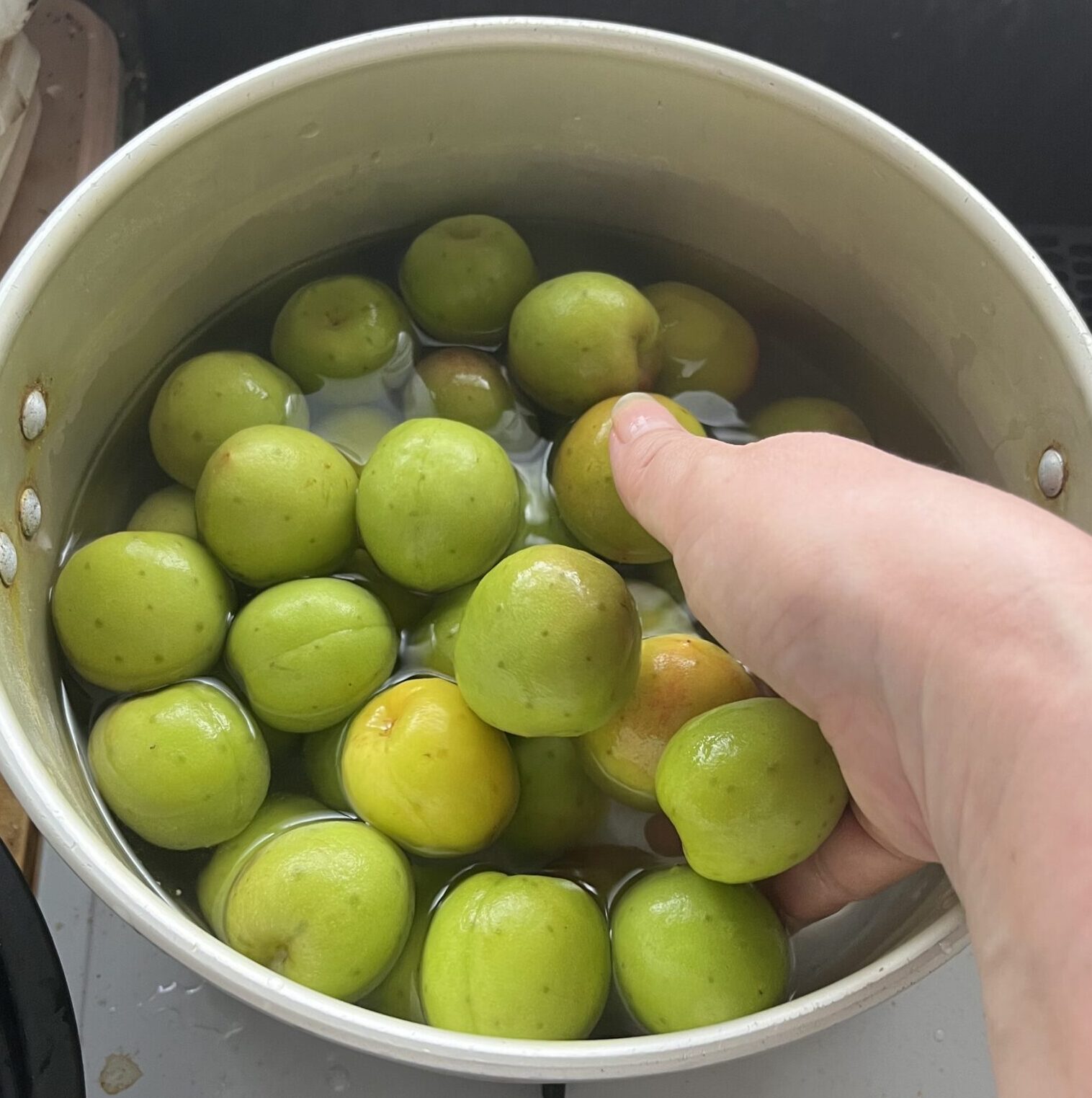 - 梅の実をさっと水洗いし、竹串で成り口のホシ(枝の軸)を取る。深い傷のある実はここで除き、重量を測っておく。