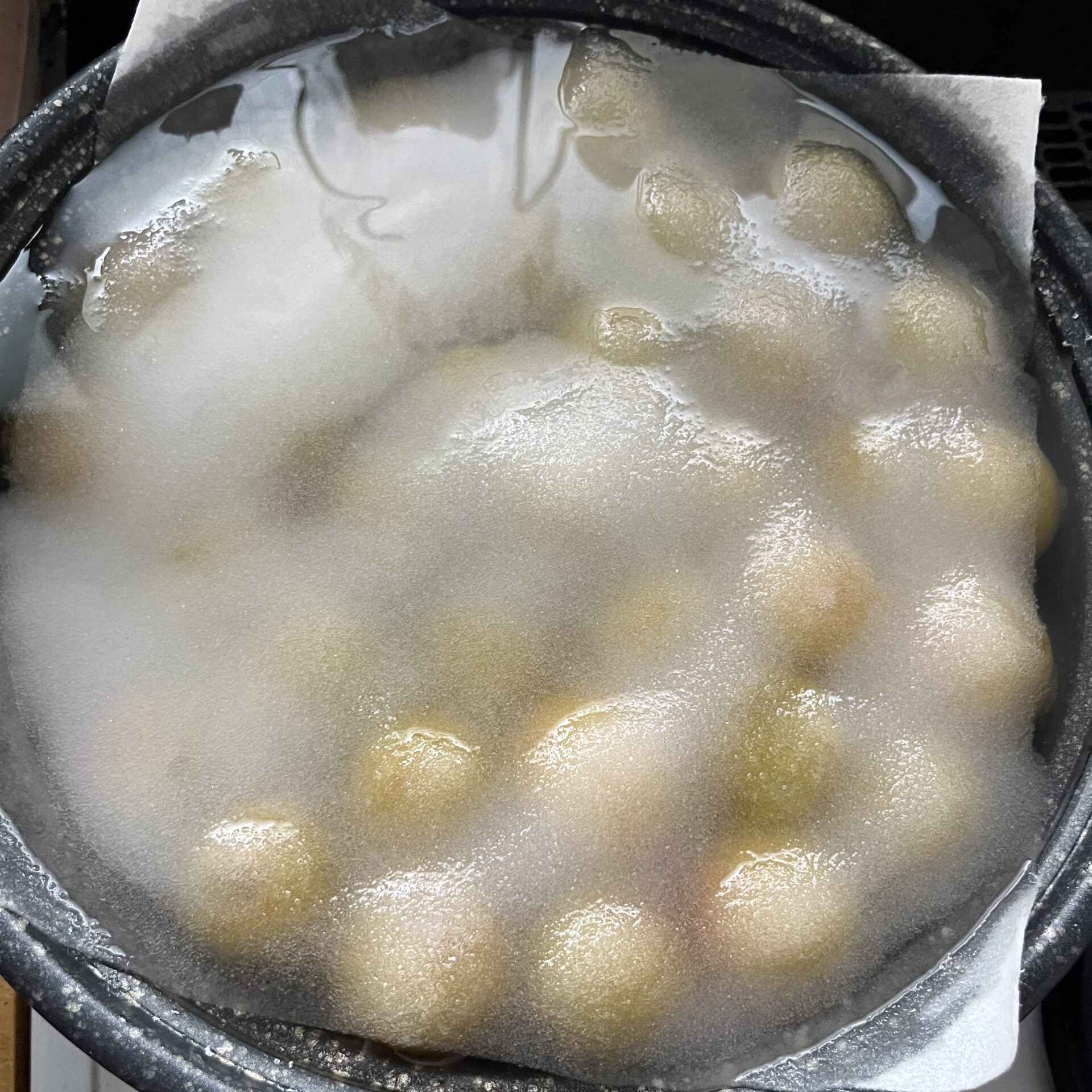 同じことを3度繰り返す。実のあくが抜け、柔らかくなる。 - 大きな鍋になるべく実が重ならないようそっと並べ、水(傷んだ実を除いた重量の1.6倍)を入れる。