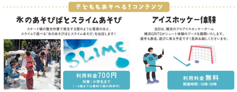 お子さまをはじめファミリーでも楽しめるイベントとして、スケートリンクの整氷時に発生する氷を活用した子ども向けの遊び場「氷のあそびば」やアイスホッケー体験のブースを設置いたします。