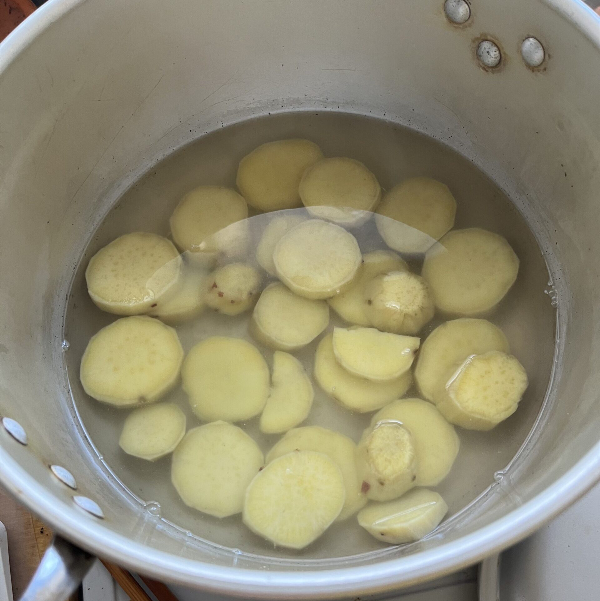 さつまいもの皮をむき輪切りにして、鍋に浸かるくらいの水(分量外)を入れて柔らかくなるまで茹でる。
