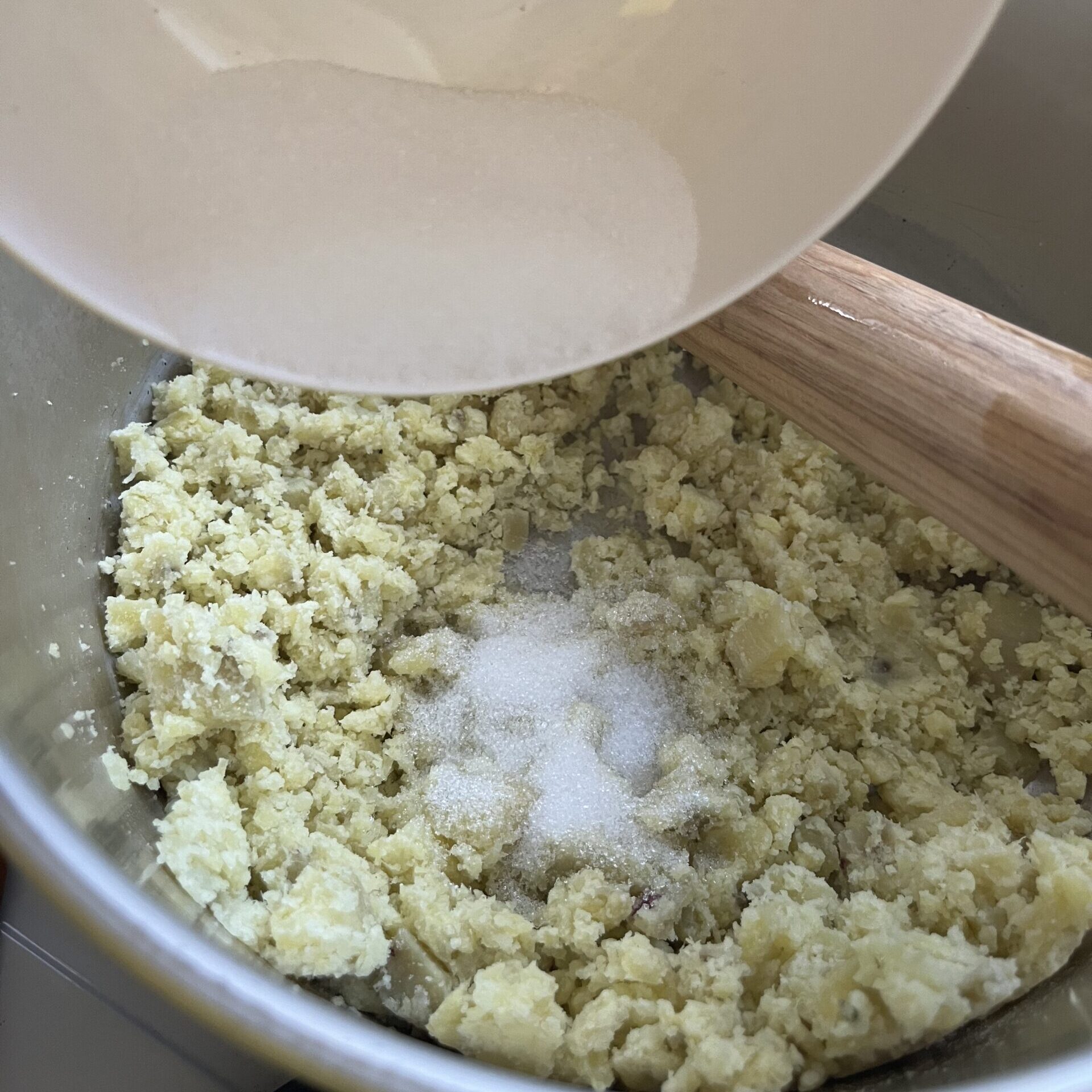 - 砂糖、卵黄を入れ、弱火にかけながらよく混ぜる。いもの甘さにより砂糖の量は調節してください。